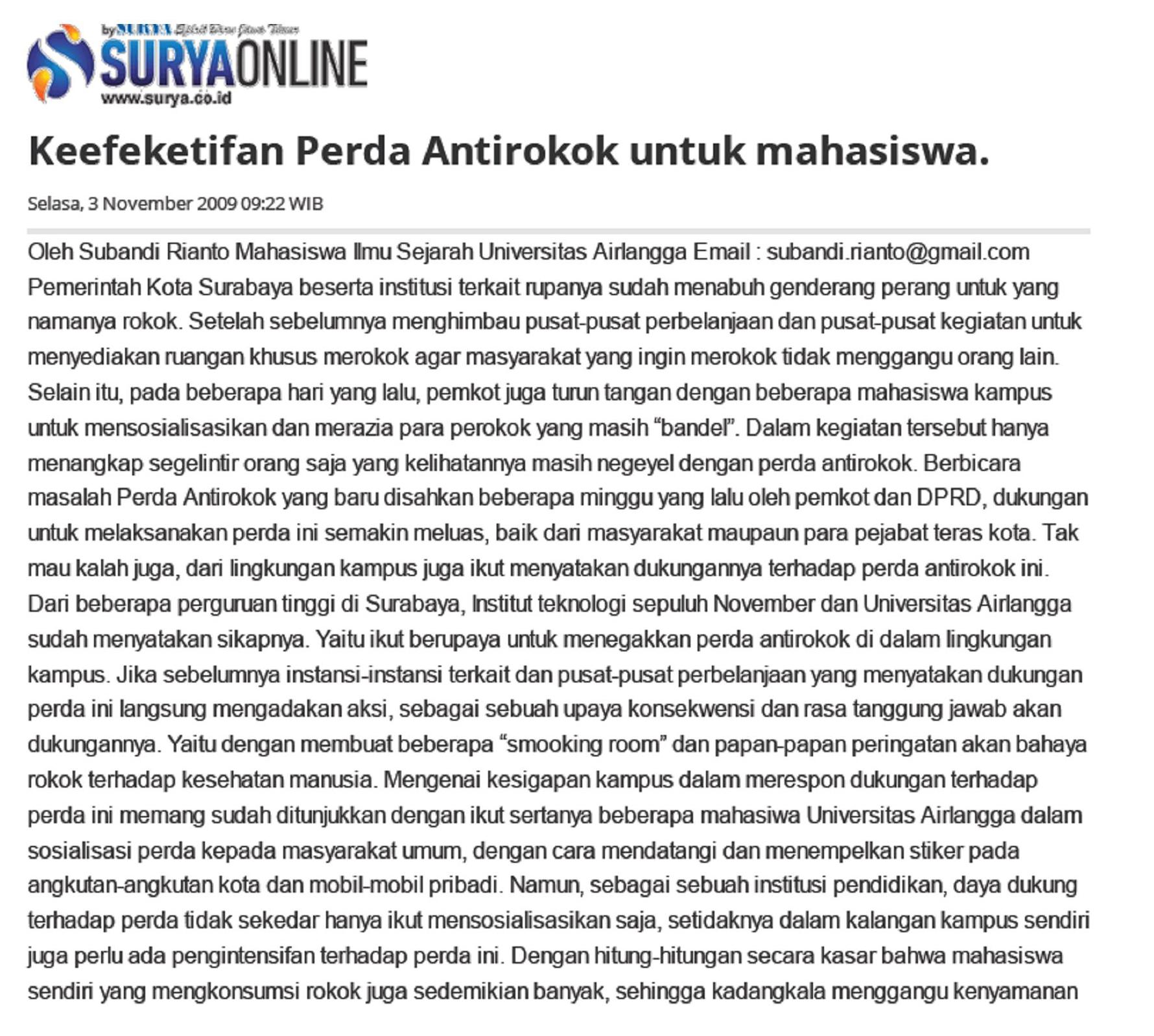 Opini dimuat Harian SURYA Jawa Timur Juli 2009 (https://surabaya.tribunnews.com/2009/11/03/keefeketifan-perda-antirokok-untuk-mahasiswa)